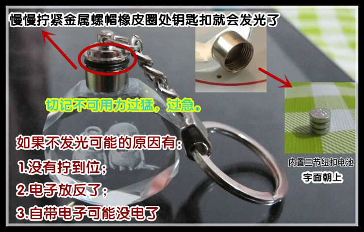 品名:七彩水晶閃光玻璃LED鑰匙扣掛件小禮物 材質(zhì):玻璃、金屬 尺寸:發(fā)光部分高度約3.2cm,總長約11cm,外包裝盒約11.5*4.8*2.5cm 包裝:單個(gè)紙盒包裝 注意:實(shí)物拍攝,可放心選購,請憑想象購物和追求無暇的親慎拍,圖案可自定義,詳細(xì)可咨詢在線客服,謝謝合作。