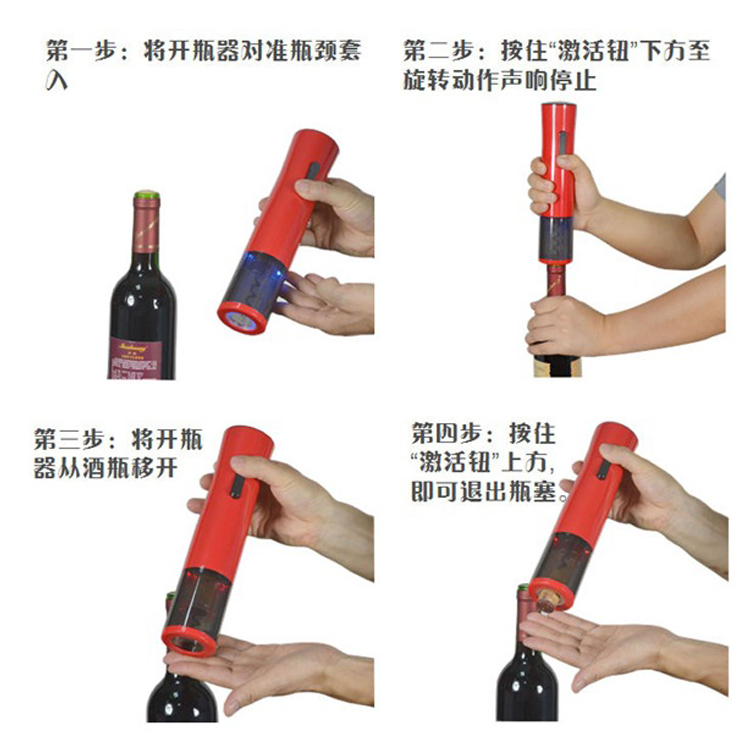 2.使用時(shí),我們先利用“割紙器”將瓶封取下,將開(kāi)瓶器對(duì)準(zhǔn)瓶頸套入,按住“激活鈕”下方至旋 轉(zhuǎn)動(dòng)作聲響停止;按住“激活鈕”上方,即可退出瓶塞。整個(gè)過(guò)程只需要幾十秒。