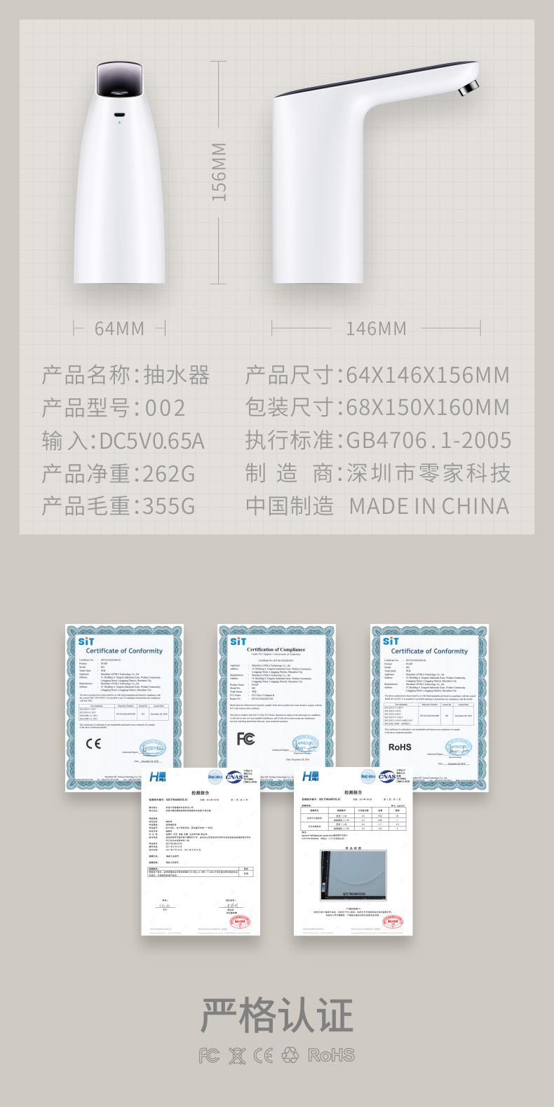 產品含彩盒的重量:262g (毛重355g)/彩盒尺寸68*150*160mm
