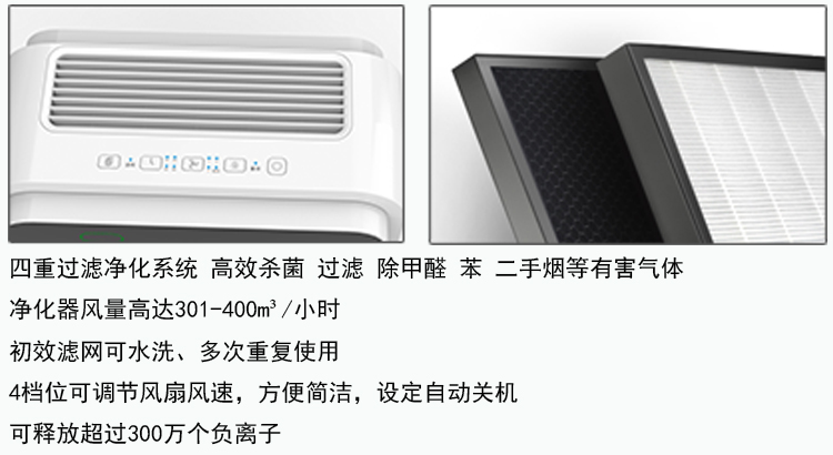 空氣凈化器功能:除苯,除甲醛,除煙塵, 除PM2.5,多層濾網