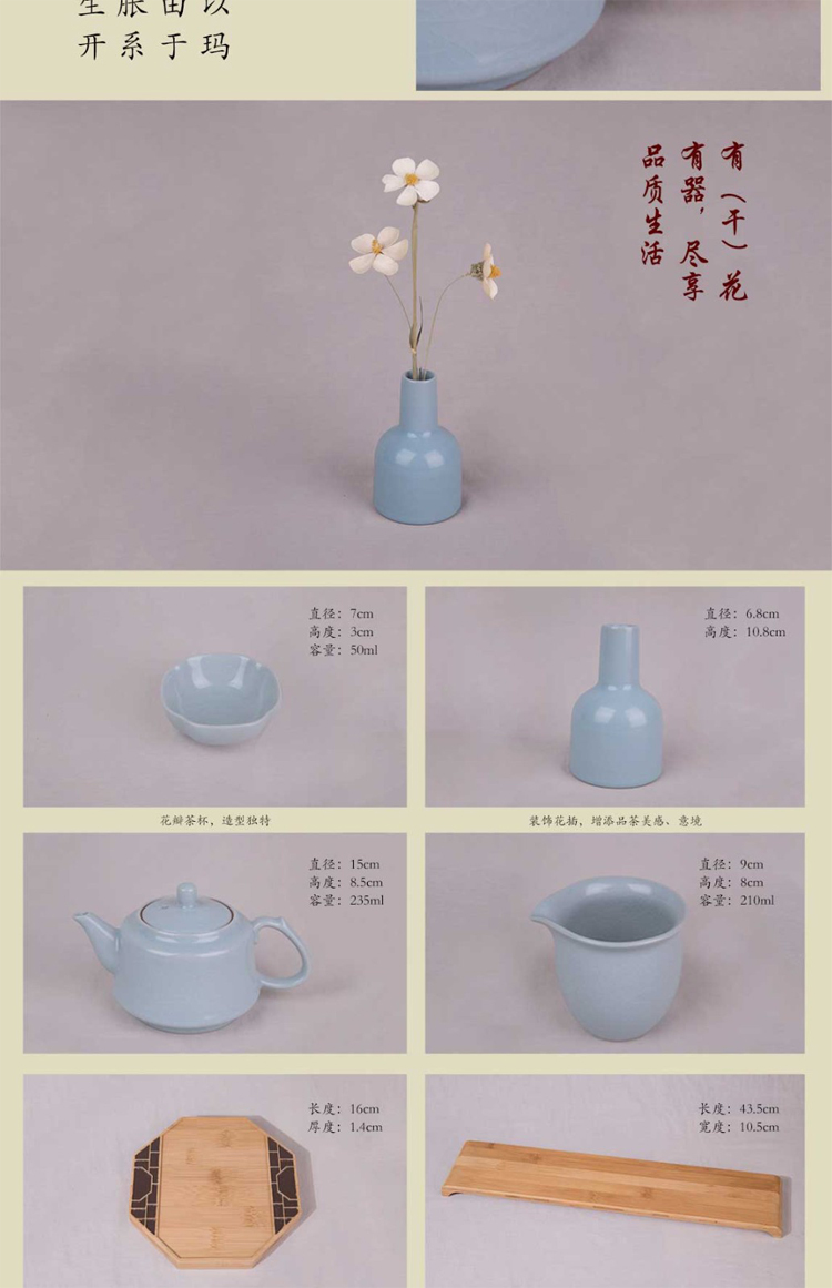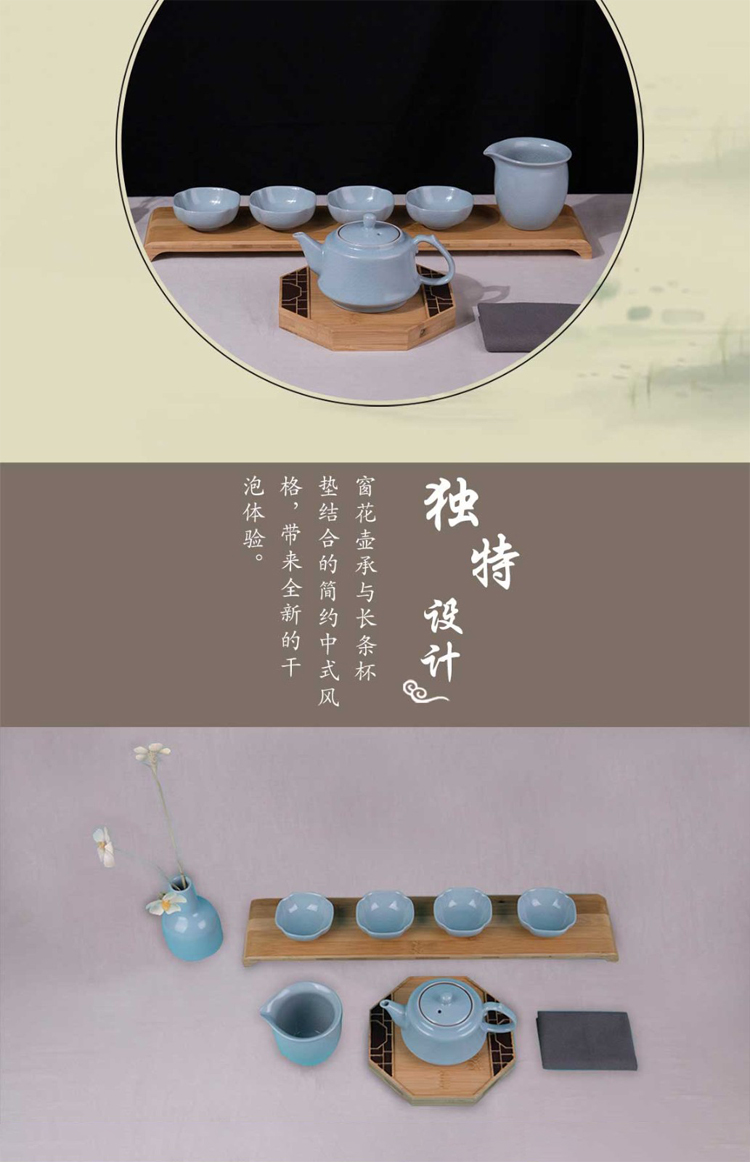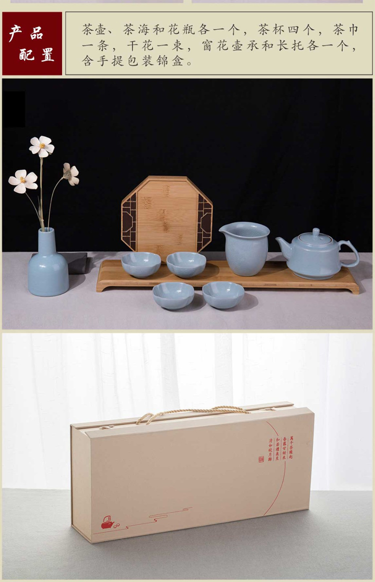 配置 茶壺、茶海和花瓶各一個,茶杯四個,茶巾一條,干花一束,窗花壺承和長托各一塊,含提手錦盒包裝