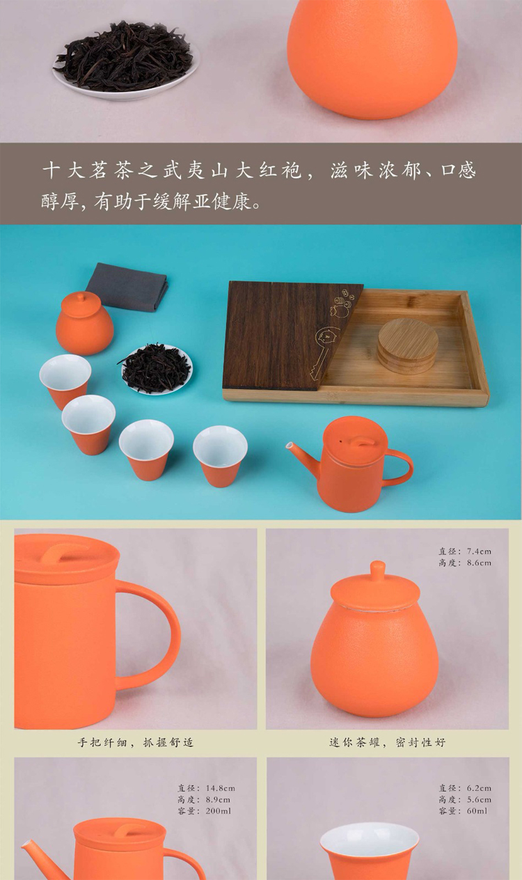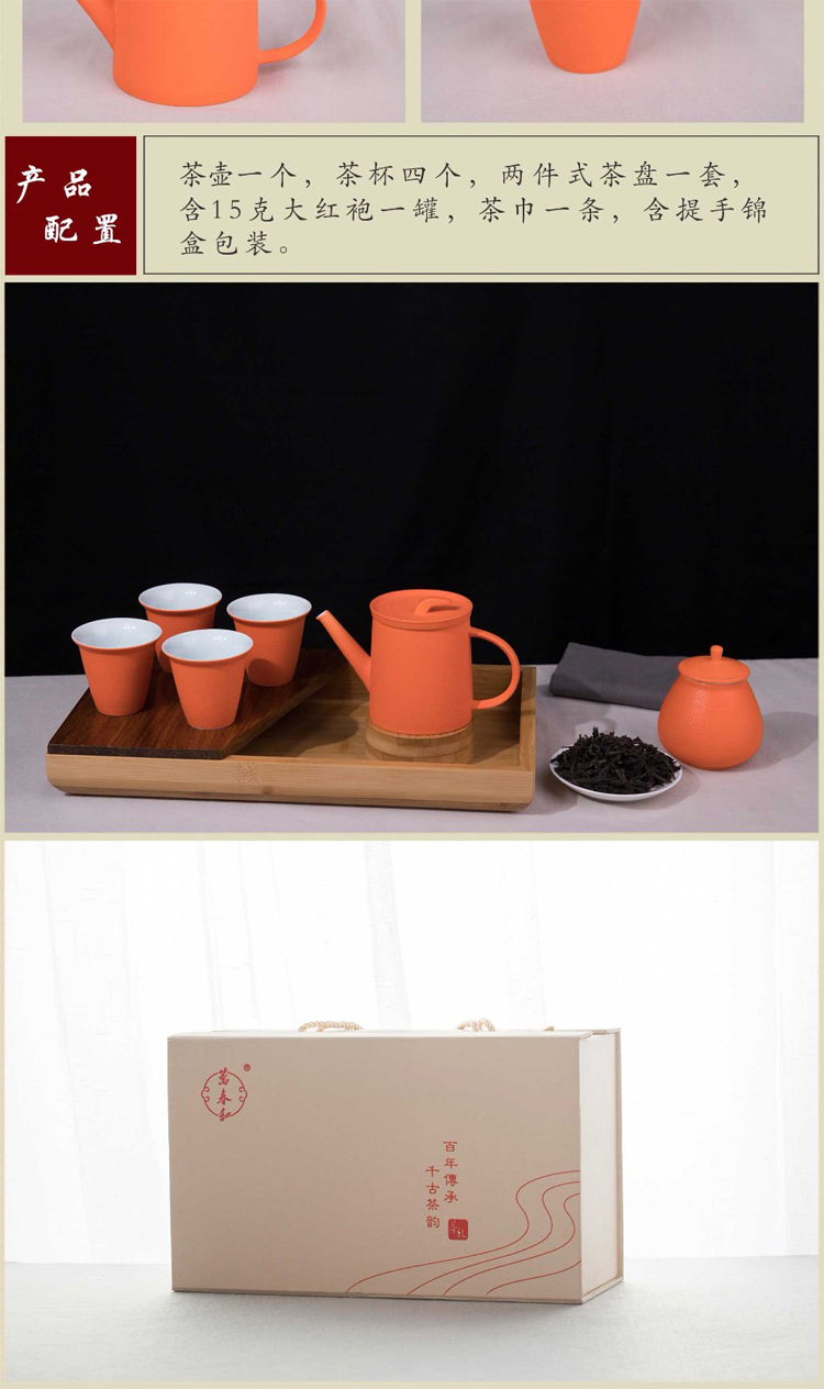 配置:茶壺一個,茶杯四個,兩件式茶盤一套,含15克大紅袍一罐,茶巾一條,含提手錦盒包裝